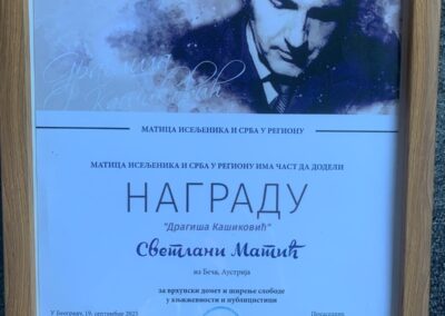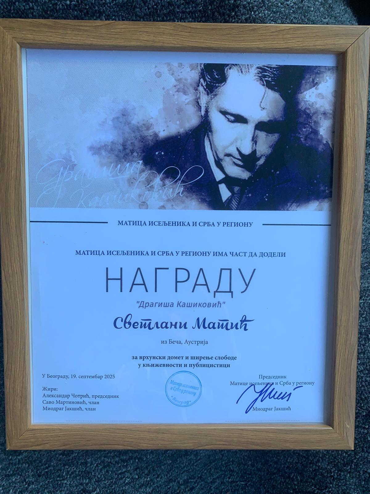 Матица исељеника и Срба у региону је академику проф. Светлани Матић, за ову специфичну књигу, доделила књижевну награду „Драгиша Кашиковић“ за публицистику, коју јој је након промоције, уручио Миодраг Јакшић, председник.