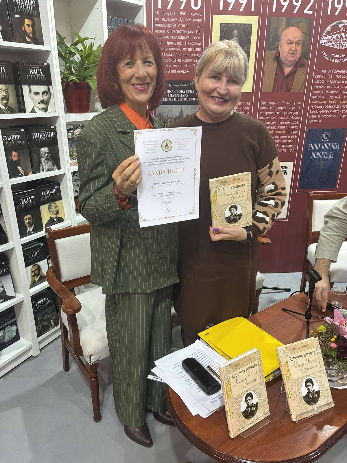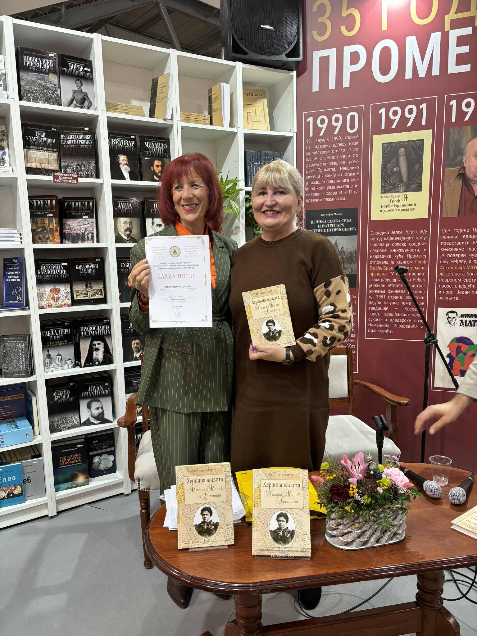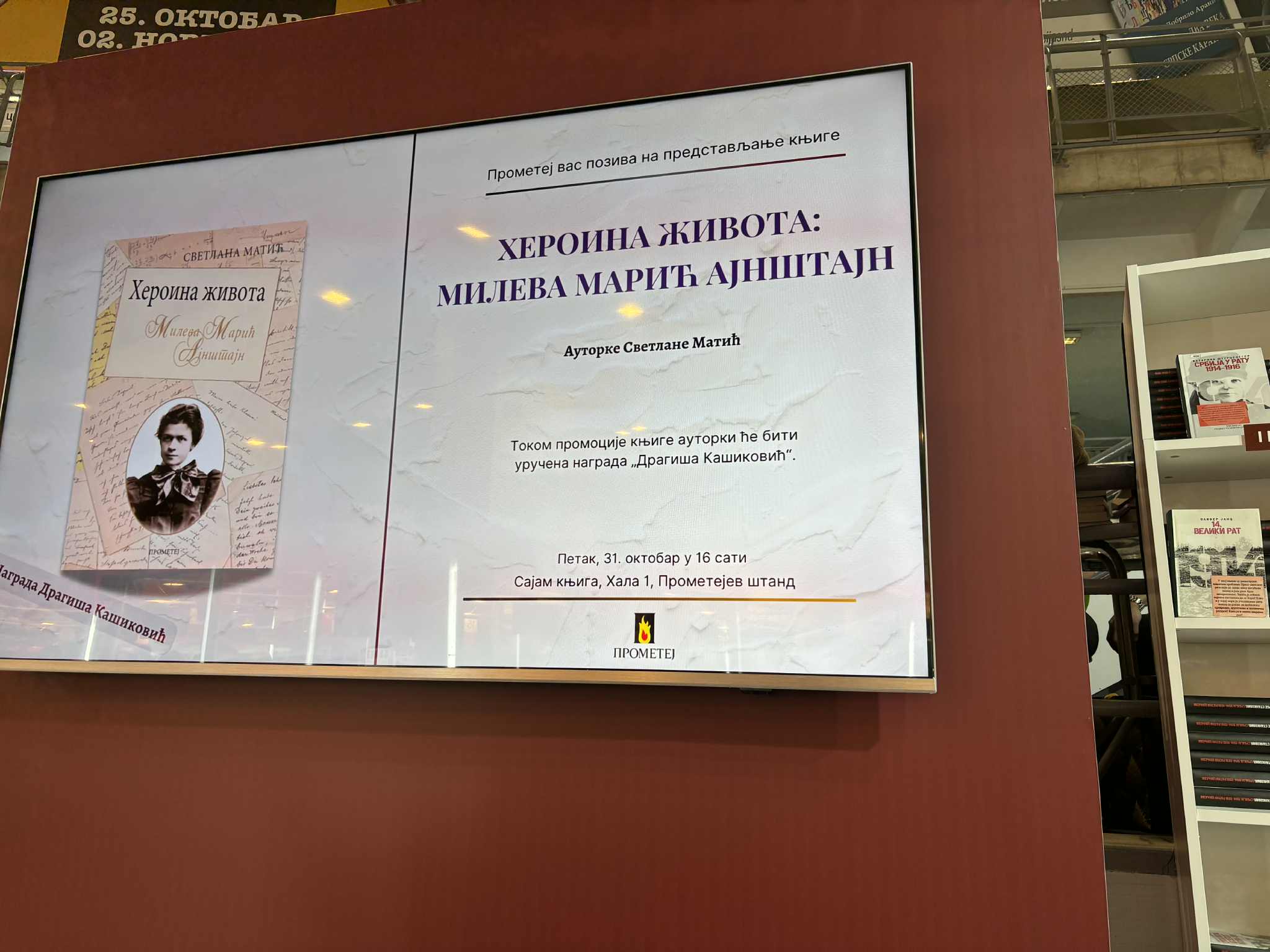 На штанду ИК „Прометеј“ из Новог Сада, који је проглашен најбољим у 2025. години, а након 35. година успешног рада и постојања, представили су се многобројни писци. Међу њима, била је и промоција књиге „Хероина живота Милева Марић Ајнштајн“, ауторке Светлане Матић из Беча у петак, 31. октобра 2025. године. О књизи су говорили проф. Радмила Сатарић, рецензент, Александар Танурџић, заменик уредника и ауторка. Рецензент др Вјера Рашковић Зец, која је подржала издавање књиге, нажалост није била на њеној презентацији.