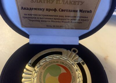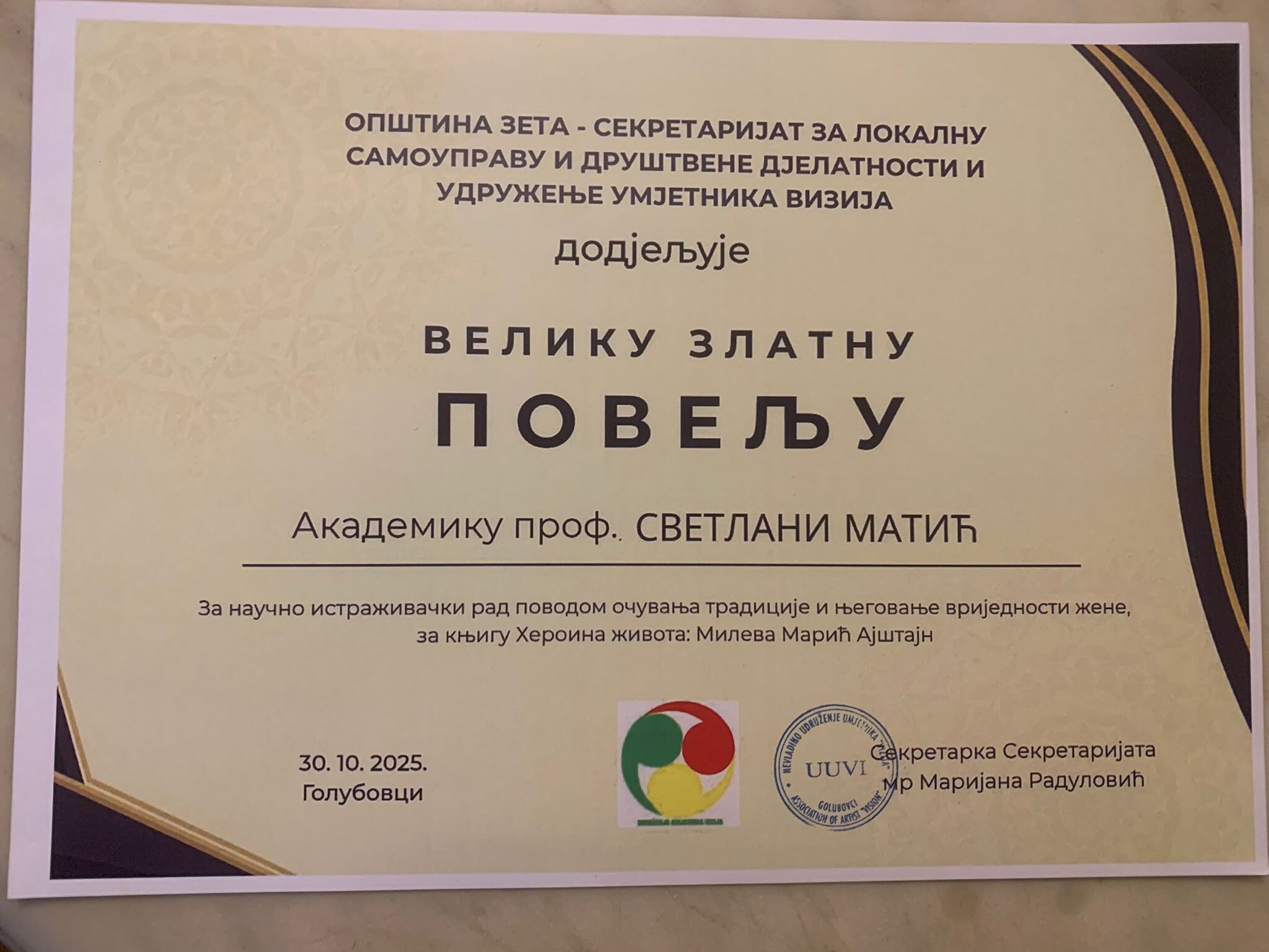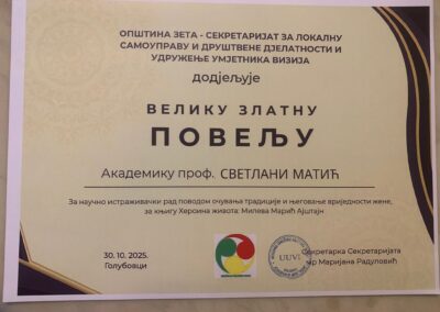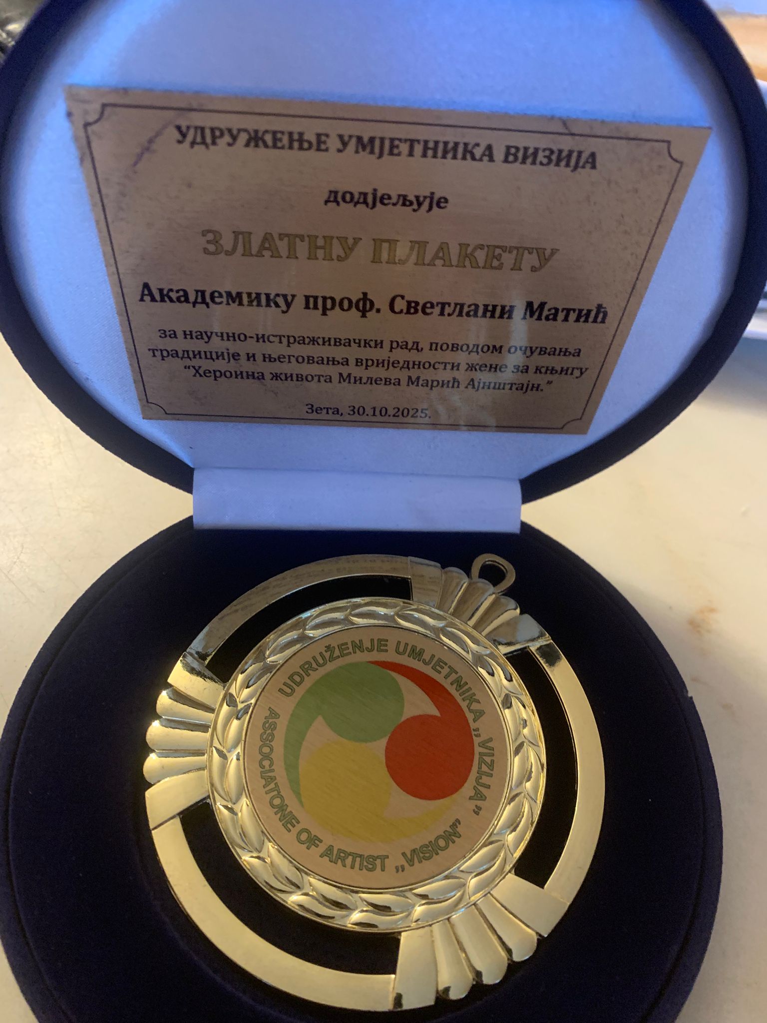Академик проф. Славка Кликовац се захвалила свима на присуству, нагласила значај успешне сарадње између Аустријско-српског културног друштва „Вилхелмина Мина Караџић“ и Удружења умјетника „Визија“, која је потврђена потписивањем Споразума о културној сарадњи. Уручила је академику проф. Светлани Матић „Велику златну повељу за научно-истраживачки рад поводом очувања традиције и његовања вриједности жене“ за књигу „Хероина живота Милева Марић Ајнштајн“.