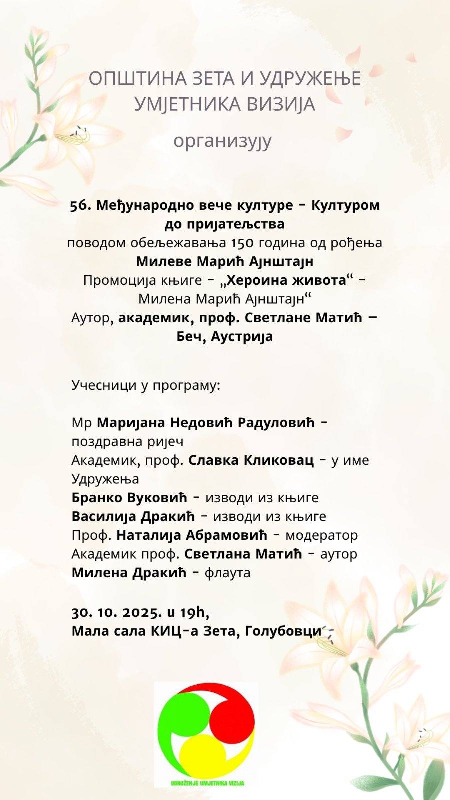 Промоција књиге „Милева Марић Ајнштајн“, ауторке Светлане Матић из Беча, одржана је у оквиру 56. Међународне вечери културе „Културом до пријатељства“.