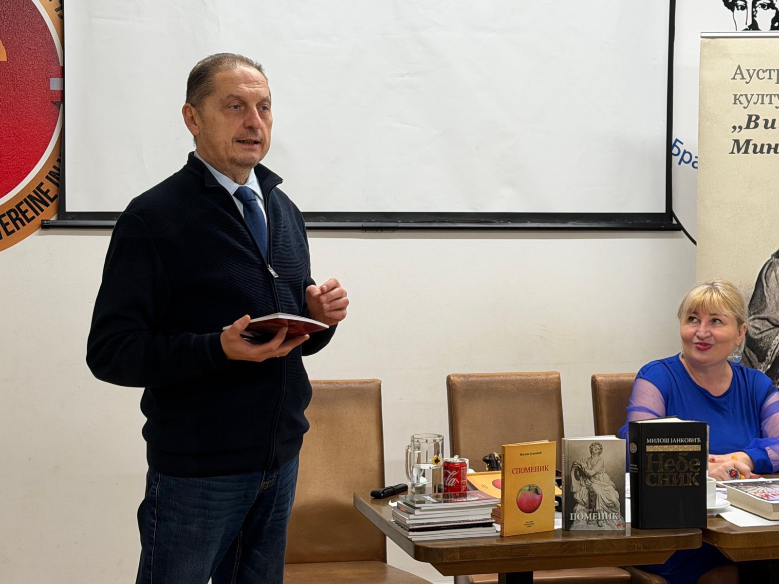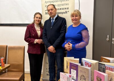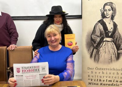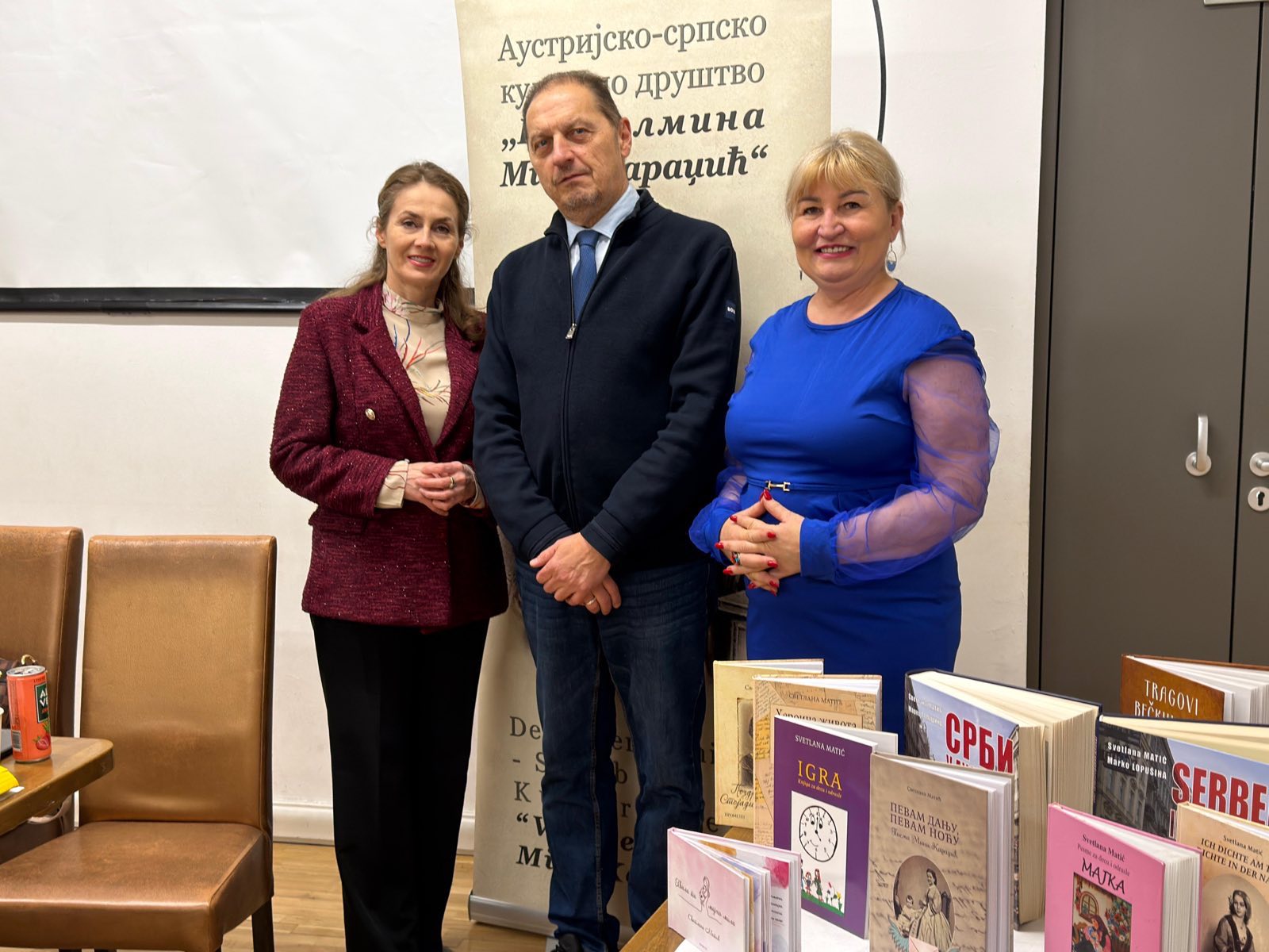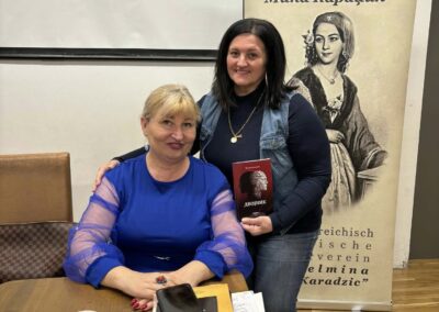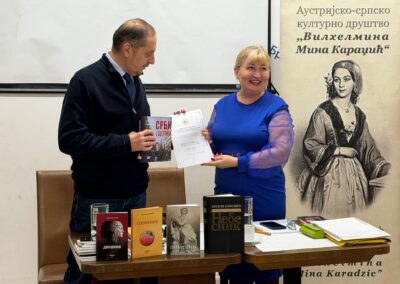 Проф. Светлана Матић је Милошу Јанковићу уручила Захвалницу у име АСКД „Вилхелмина Мина Караџић“ за одршку у раду друштва и монографију „Срби у Аустрији“, коју је изнедрила заједно са Др Марком Лопушином. За узврат Милош Јанковић је матићевој поклонио своју књигу „Небесник“.